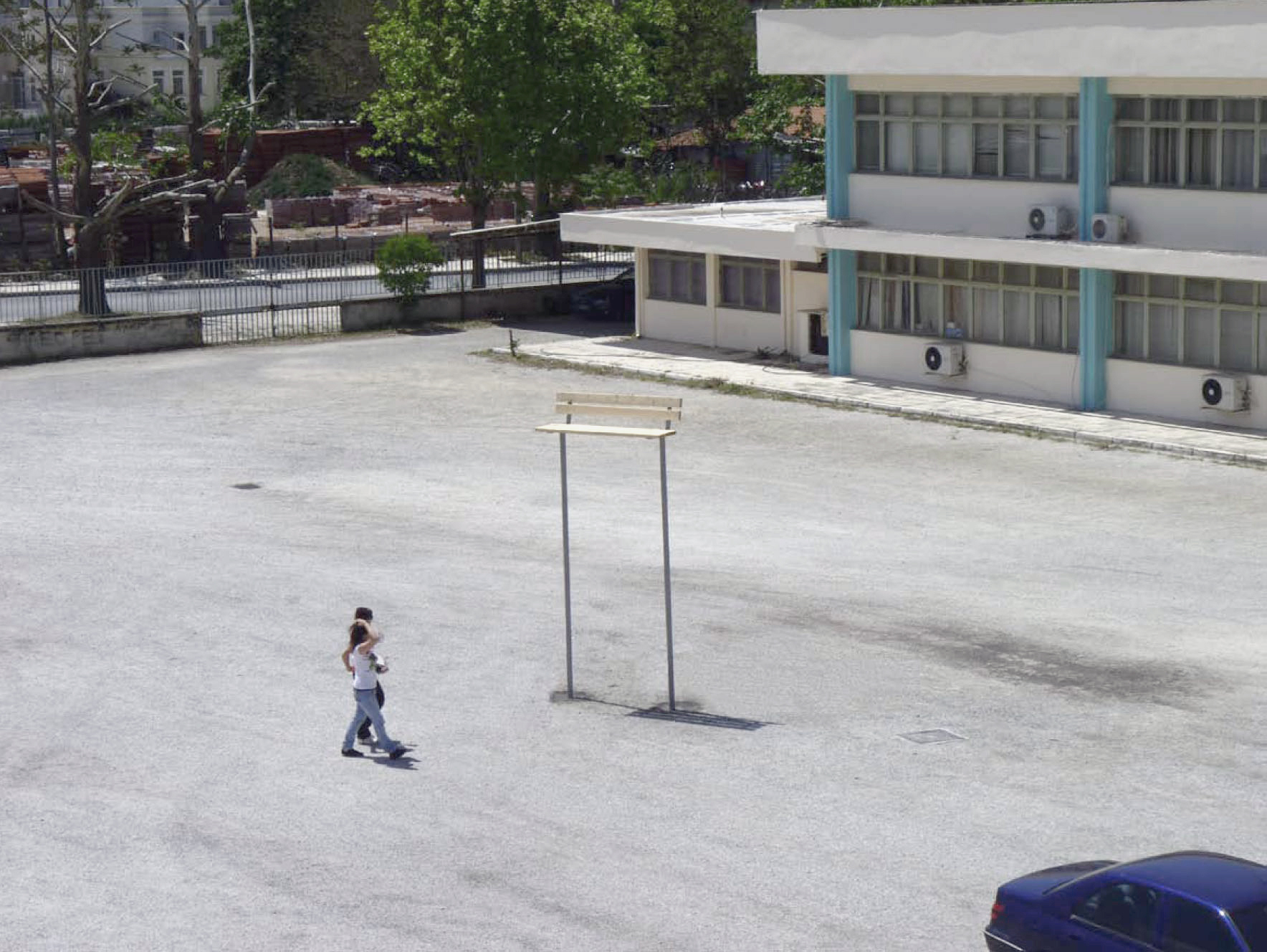 We constructed and placed in the center of this forecourt of the University a sitting bench of normal proportions which was raised to a height of 3.5 m from the ground. The gesture of raising this public bench automatically entails the cancellation of its properties and highlights its uselessness. The unique presence of this architectural element in the center of this space underlines its emptiness especially in combination with the absence of any other elements which might indicate some social activity. The construction is oriented in such a way that it’s imaginary user would be facing the empty space between the two buildings but also virtually towards the center of the city.