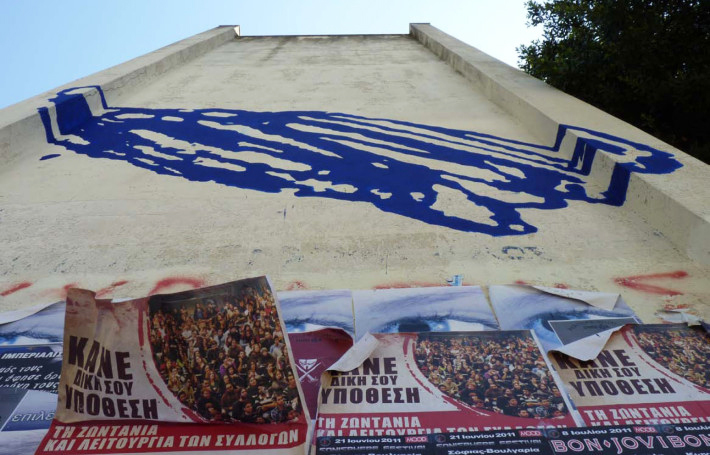 On the wall of a street for pedestrians which is on the left as to the Entrance of the University and at a spot which is visible from the highway, we enlarged and copied a smudge of real dimensions 1cm x 1.5cm. The copy was an exact replica made through the use of a projector and in the color of a blue Bic pen.