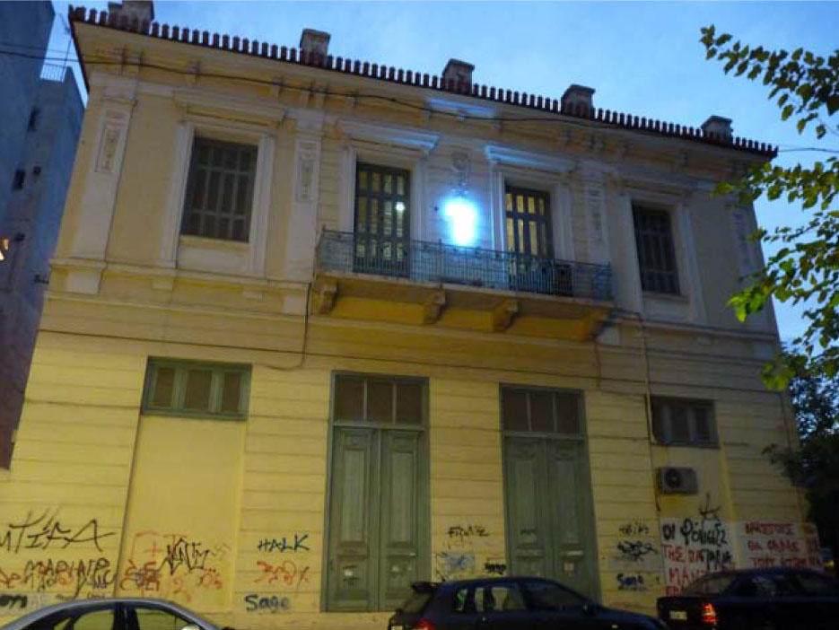 The building is located in the area around Vathi Square in the center of Athens, the area of interest of our book Je veux être Chateaubriand ou rien. We placed this work here to create a symbolic connection between the rich and prosperous southern suburb of Vouliagmeni and the deteriorated neighborhood where the derelict building is located.