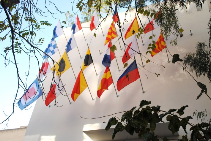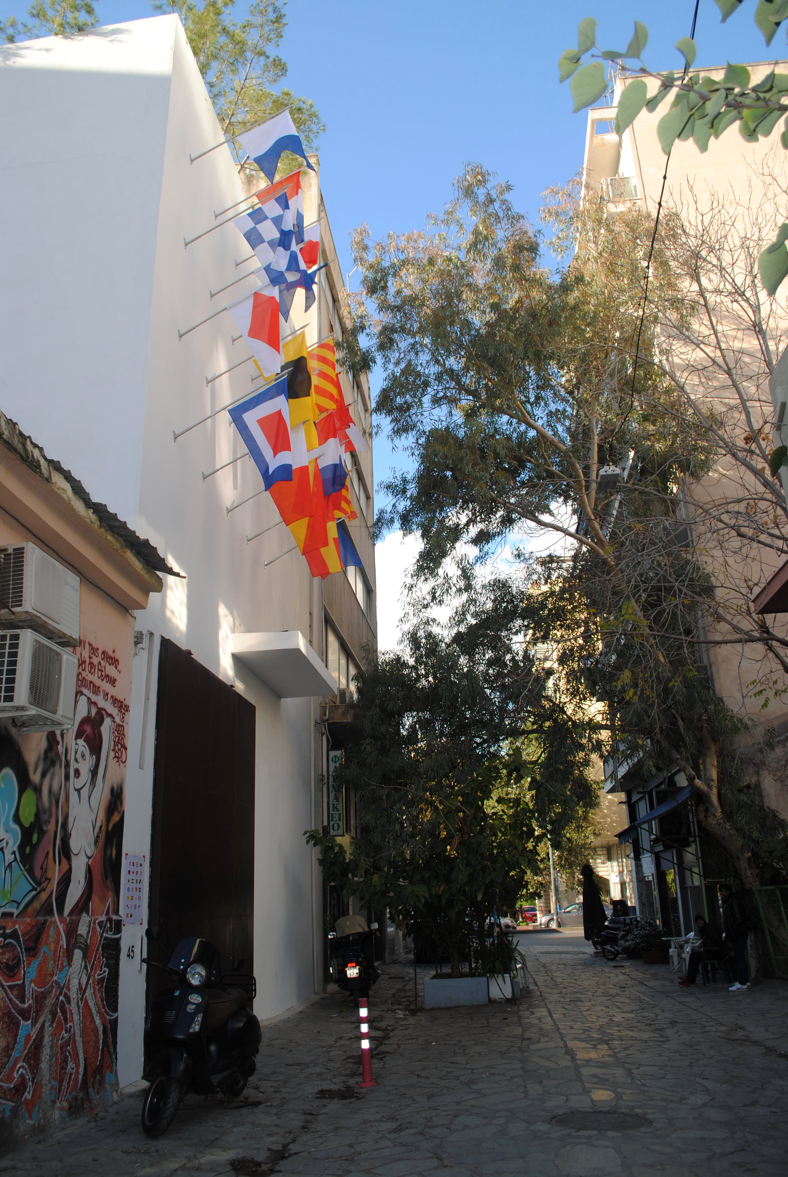 Arbit City have created a vexillological installation for Breeder Skin, with a series of coded phrases. The artwork consists of a grid of maritime signal flags, that brings together the universe of naval communications and flashy quotes for the public space. Placed on sculpturally made poles and bases and installed on the facade of the building, it uses the flamboyant stature of the flag in contrast with the run-down enviroment of the area.