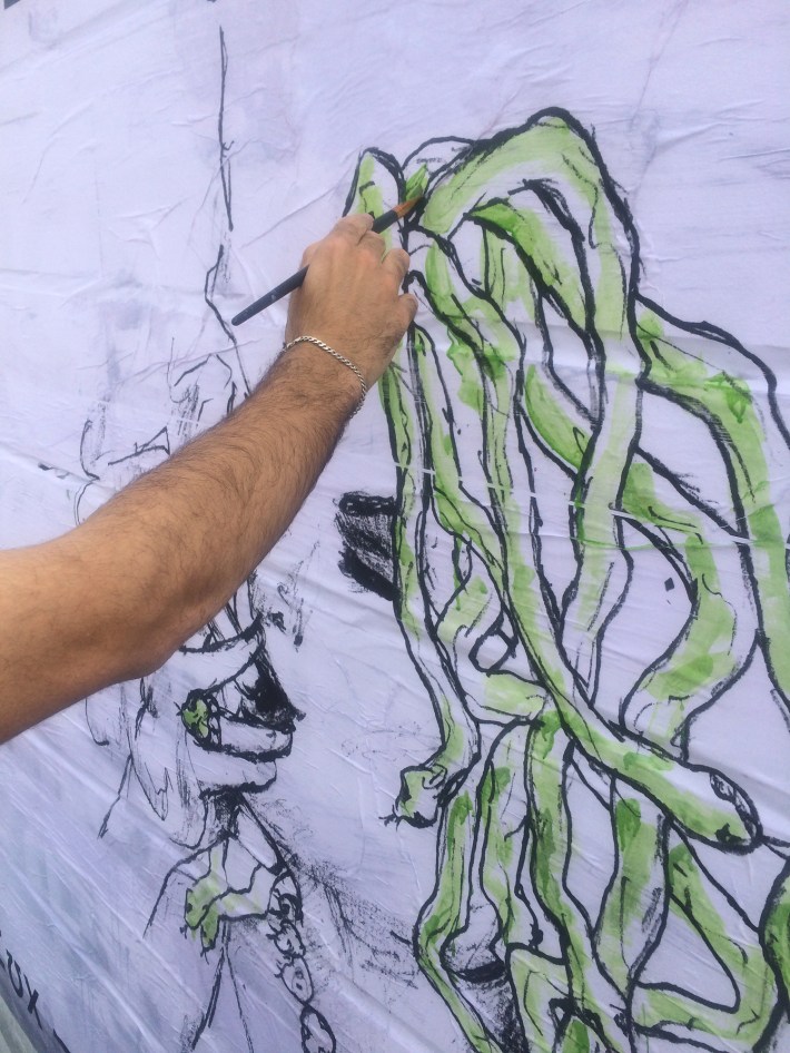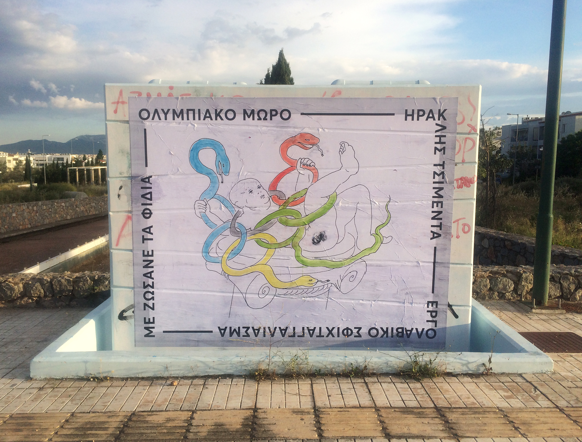 Στο πλαίσιο της έκθεσης SLOWER smaller WEAKER στο Ολυμπιακό χωριό στις Αχαρνές της Αθήνας, οργανώσαμε ένα workshop σε συνεργασία με τον σύλλογο ‘Νέα Γενιά Ολυμπιακού Χωριού’. Στόχος ήταν η συλλογή υλικού για την πραγματοποίηση μιας καμπάνιας γιγαντοαφισών στον δημόσιο χώρο με ποιητικές φράσεις-χαικού και σχέδια που σχετίζονται με την τοπική συνθήκη, την ύπαρξη και τη συνύπαρξη στο Ολυμπιακό χωριό. Παράλληλα με τις επιζωγραφισμένες αφίσες στον δημόσιο χώρο εκτέθηκε ένα φωτογραφικό άλμπουμ με την καταγραφή της διαδικασίας αλλά και με λεπτομέρειες από το περιβάλλον του χωριού. Η ομαδική έκθεση SLOWER smaller WEAKER πραγματοποιήθηκε την άνοιξη του 2018 σε επιμέλεια της Αλεξάνδρας Στρέσνα και υπό την αιγίδα του μη κερδοσκοπικού οργανισμού APEXART στη Νέα Υόρκη.